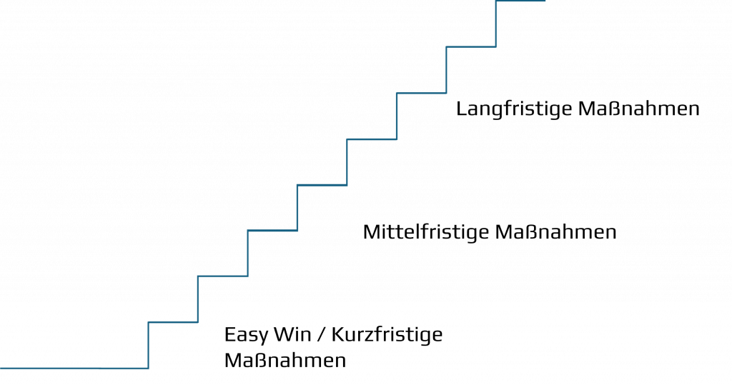 - Das Treppendiagramm wird eingeführt (Einteilung der Maßnahmen in „leicht umsetzbare“, „mittelfristige“ und „langfristige“ Maßnahmen)