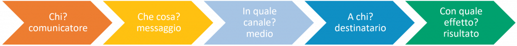 Il modello descrive il processo di comunicazione con cinque componenti: chi (il mittente/comunicatore), dice cosa (il messaggio), attraverso quale canale (il mezzo), a chi (il destinatario) e con quale effetto (il risultato).