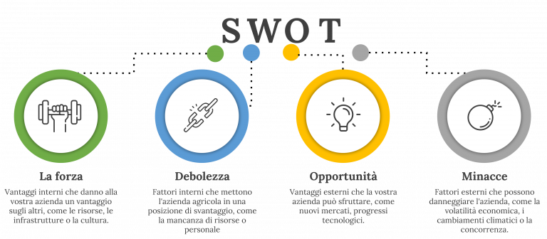 • Pensate ai punti di forza e di debolezza della vostra azienda agricola e a come i fattori esterni influiscono sullo sviluppo della vostra azienda 🡪 Lavorate sul documento esterno “Foglio di lavoro per l’analisi SWOT”.